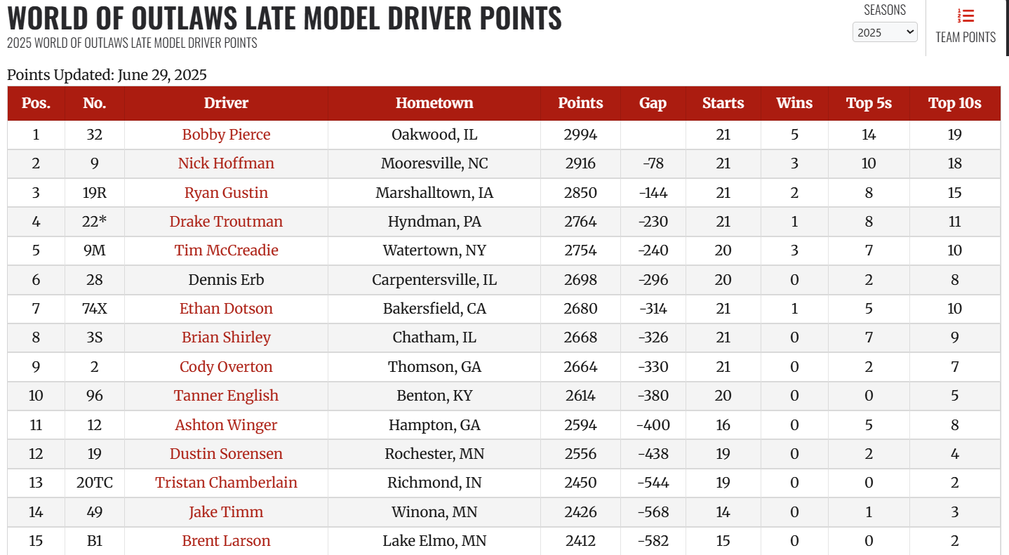 Pierce’s second place was his best finish in the swing to North Dakota and Minnesota over the weekend. He finished 6th at River Cities Speedway on Friday and 7th at Norman County on Saturday. He saw his points lead over Nick Hoffman shrink to just 78 points after Hoffman won at both River Cities and Norman County.