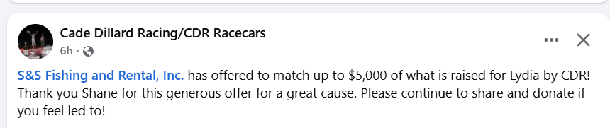 In an update, Cade Dillard Racing announced that “S&S Fishing and Rental, Inc. has offered to match up to $5,000 of what is raised for Lydia by CDR! Thank you Shane for this generous offer for a great cause. Please continue to share and donate if you feel led to!”