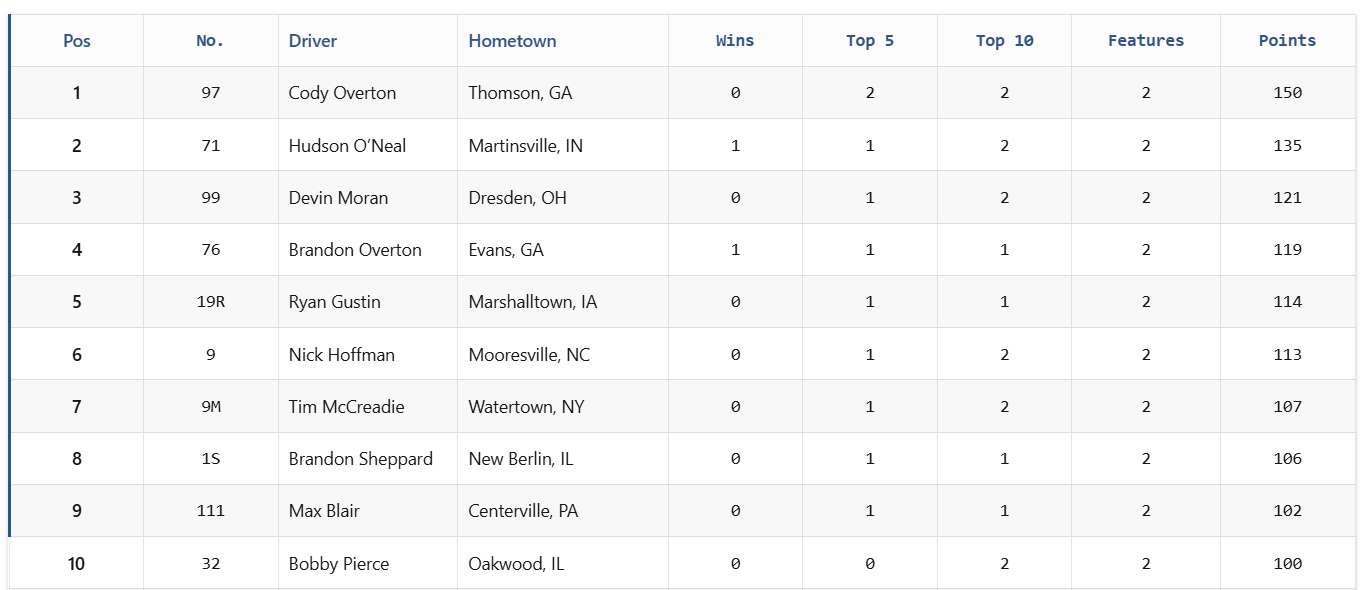 Devin Moran, Brandon Overton, Ryan Gustin, Nick Hoffman, Tim McCreadie, Brandon Sheppard, Max Blair, and Bobby Pierce round out the top 10 in the standings.