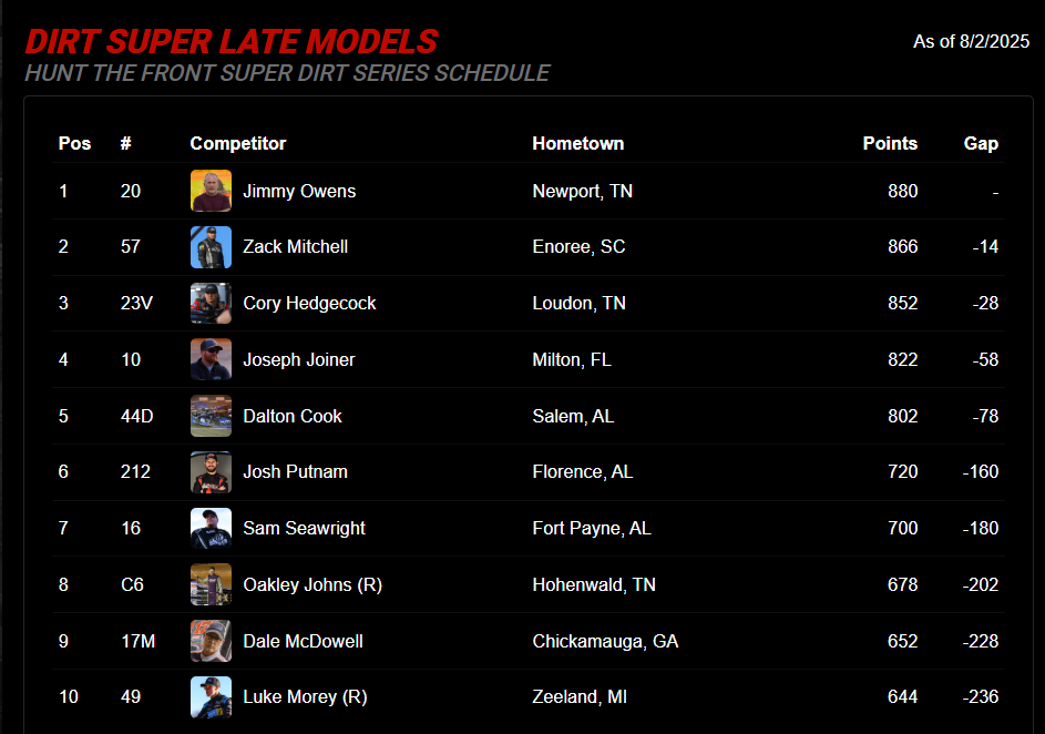 Hedgecock has run well in his BMF Race Car this year. He’s won 6 races, scored 17 top 5s and 25 Top 10s in just 35 features albeit one of those wins was with CRUSA at I-75 Raceway for the J.T. Kerr Memorial. Most recently he had a strong performance at Florence Speedway for the North/South 100 finishing in 9th. Earlier this year he finished third in the 2025 Spring Nationals Point standings behind Garrett Smith and Wil Herrington. He’s currently third in the Hunt the Front Super Dirt Series just 28 points behind current leader Jimmy Owens. In 11 features with the series, he racked up one win at Lake Cumberland at the end of June and amassed 5 top 5s and 8 top 10s.