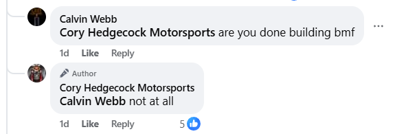 The post has sparked quite a bit of debate and conversation given Hedgecock is one of three individuals alongside his father Chad and fabricator Bruce Nunnally behind BMF Race Cars. However, he made clear in the comments that he is not done building his BMF chassis.