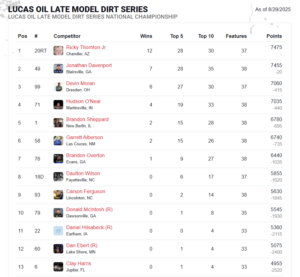 With the results of the Hillbilly 100 opener, the Big River Steel Chase for the Championship continued to tighten. Ricky Thornton Jr. extended his points lead with a fifth place finish. He now has a 20 point advantage over Jonathan Davenport, who fell to 7th on the final restart. Moran is 415 points behind, but he extended his gap over Hudson O’Neal and Brandon Sheppard. He has a 25 point advantage over O’Neal who is in fourth. O’Neal also extended his advantage over Brandon Sheppard with a third place finish. He now has a 255 point advantage over Sheppard. Meanwhile, Alberson, who is currently 6th in points, shaved off 40 points to O’Neal. He’s only 295 points out of the fourth position now.