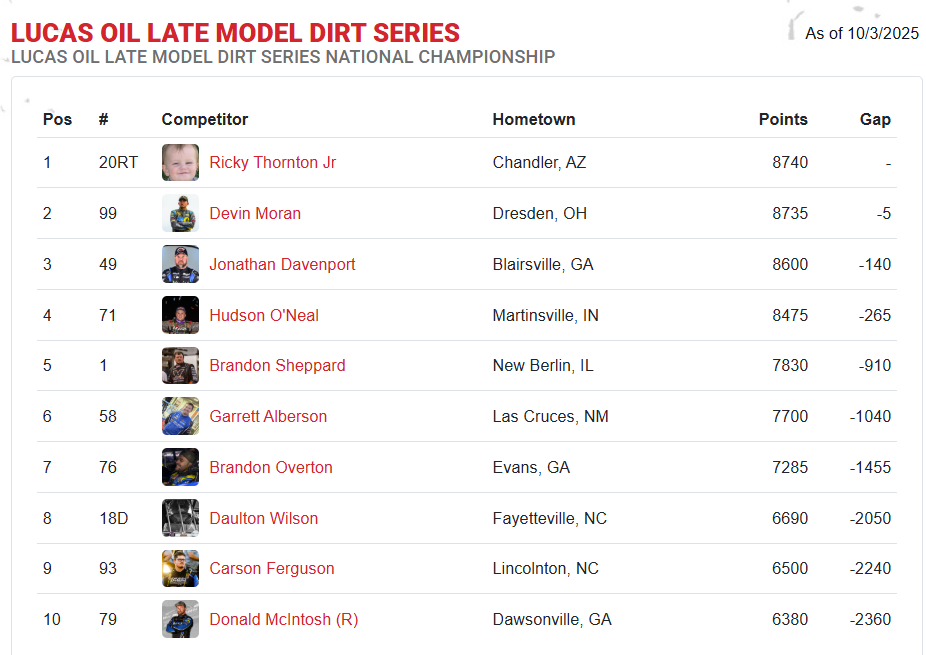 Moran was able to reclaim the lead due to Thornton’s misfortune, and never looked book leading the final 16 laps of the race and claiming the $10,000 check. However, he did not come out of the night with the Lucas Oil Late Model Dirt Series points lead as Thornton put on a whale of a show in the closing laps moving from 18th to finish with a 9th place finish.