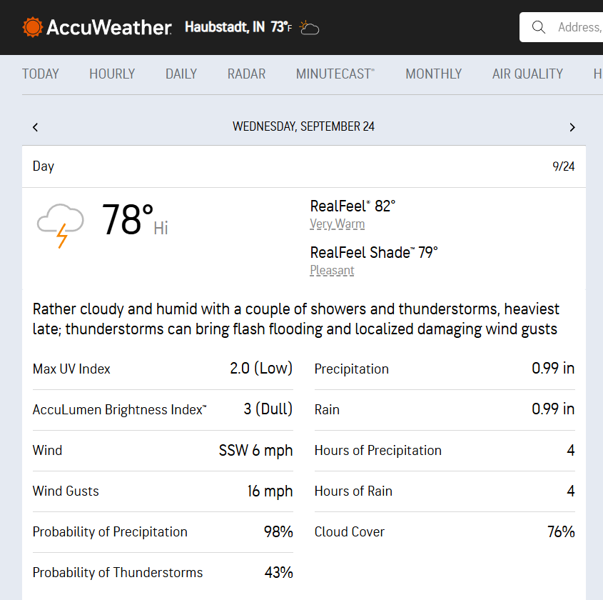 AccuWeather does note that there is currently a 98% chance of precipitation on Wednesday. Additionally, the site predicts, “Rather cloudy and humid with a couple of showers and thunderstorms, heaviest late; thunderstorms can bring flash flooding and localized damaging wind gusts.”