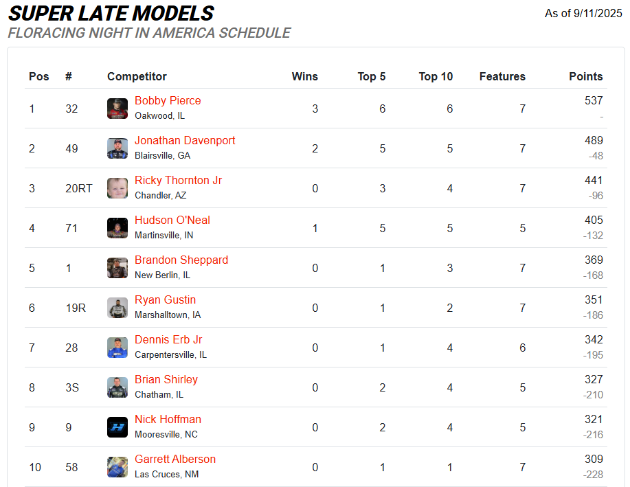Those final two races will also determine who will be crowned the series champion. Currently, Bobby Pierce is the points leader. He has a 48 point advantage over Jonathan Davenport and a 96 point advantage over last year’s champion Ricky Thornton Jr.