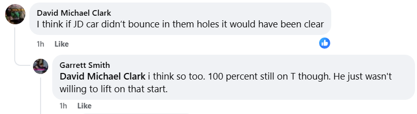 Garrett Smith also shared his thoughts in the comments. David Michael Clark posited, “I think if JD car didn’t bounce in them holes it would have been clear.”
