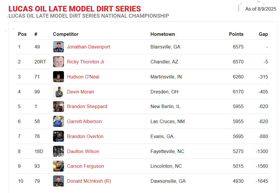 Pierce took home the win and the $75,000 paycheck. Ricky Thornton Jr. finished second while Davenport capped off the podium. Devin Moran finished fourth while Zack Dohm rounded out your top 5. With Davenport finishing in third and Thornton in second the battle for the points lead tightened. Davenport now has just a five point lead over Thornton.