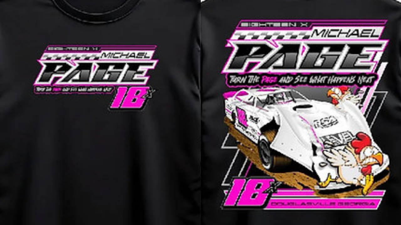 Michael Page showed off a new shirt design referencing his fight with Cory Hedgecock during the Hunt the Front race at Senoia earlier this month.