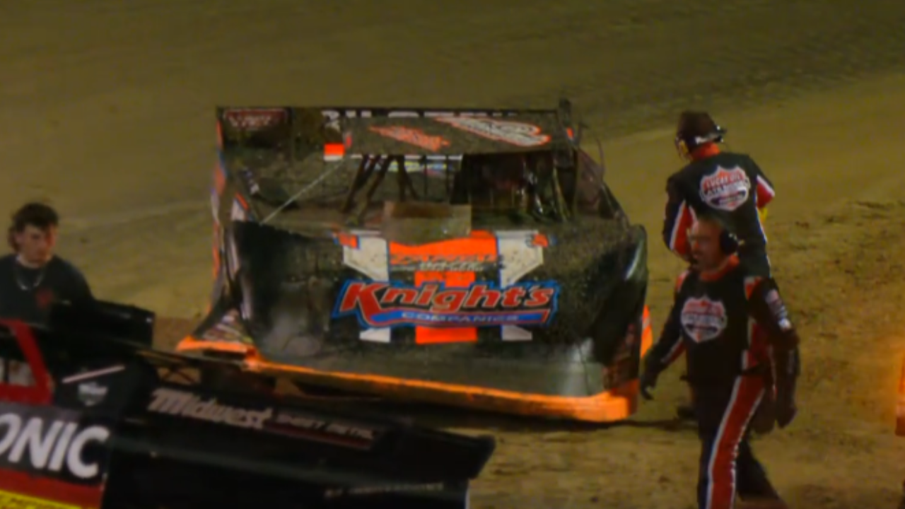 With his fourth place finish in the heat Thornton started 16th in the feature. And he rode around there for much of the beginning portion of the feature. For example, 10 laps into the race and he was sitting in 17th. Following a caution for Chris Madden with 26 laps left, Thornton suffered right front damage after the inside line stacked up on a restart and Jackson Hise and Dillon McCowan spun. Thornton piled into the rear of Cory Hedgecock.