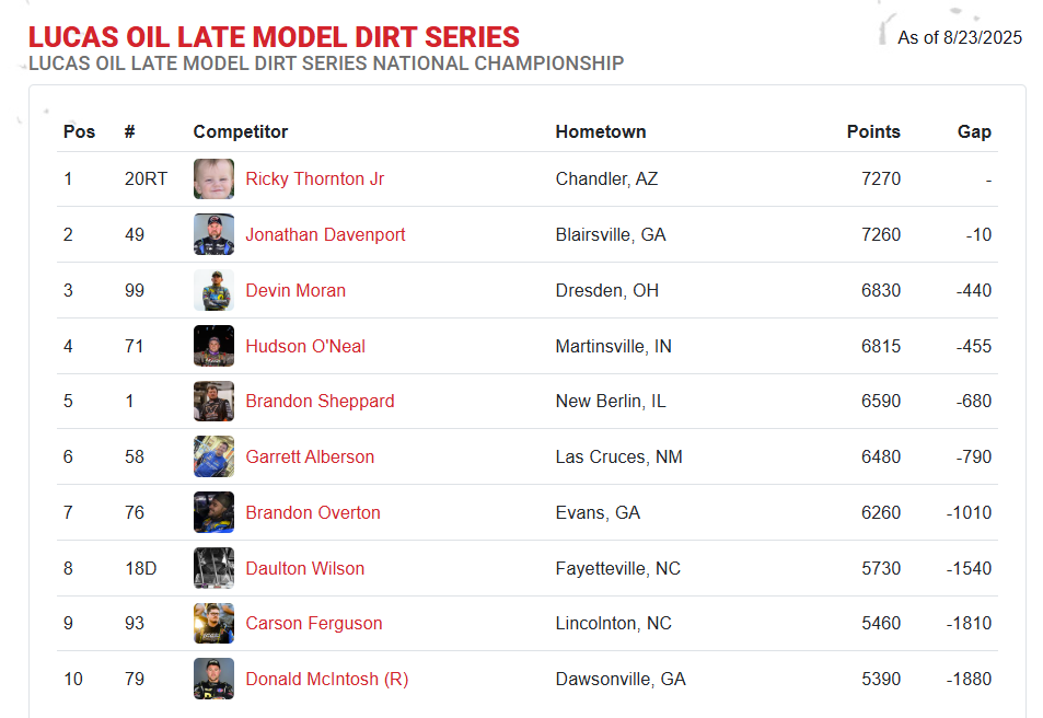 With the win Ricky Thornton Jr. reclaims the Lucas Oil Late Model Dirt Series points lead. He now holds a 10 points advantage over Jonathan Davenport, who finished in fifth. Devin Moran, who finished third, reclaimed the third spot in the points from Hudson O’Neal, who finished 10th.