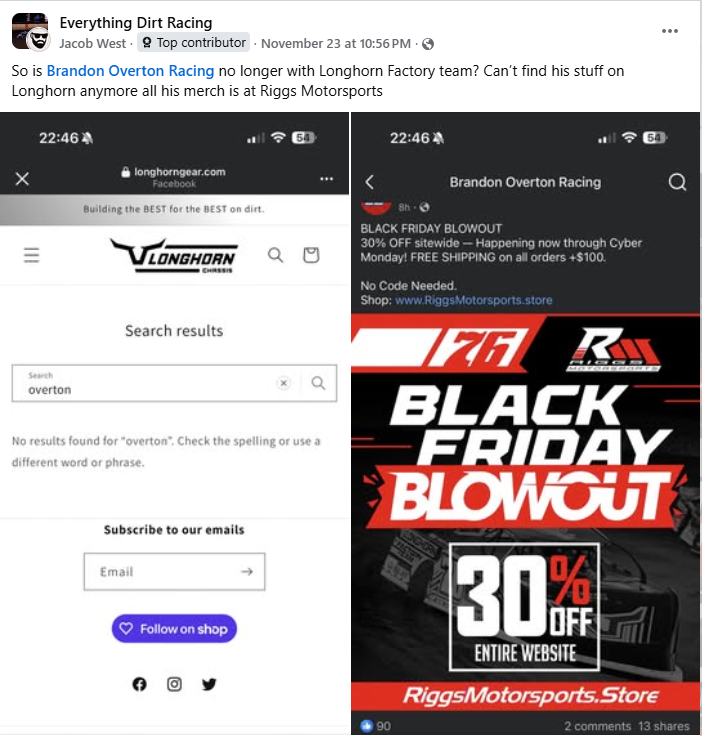As far as those suspicions they include fans noticing that Brandon Overton’s merchandise was no longer available on the Longhorn website. Fan Jacob West noticed this earlier this week and shared into the Everything Dirt Racing Facebook group, “So is Brandon Overton no longer with Longhorn Factory team? Can’t find his stuff on Longhorn anymore all his merch is at Riggs Motorsports.”