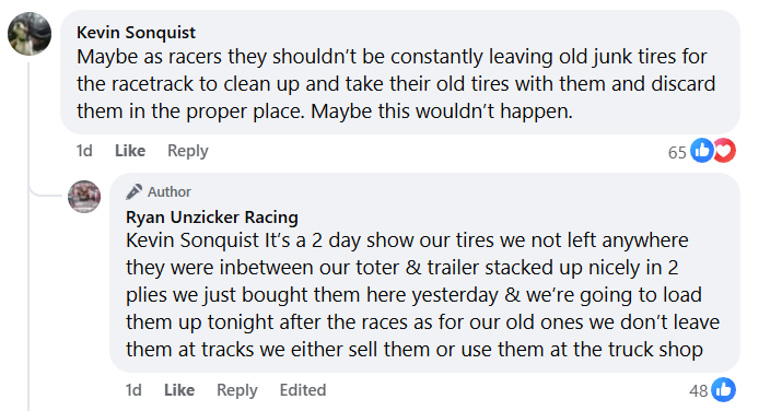 In another post on Saturday night, Unzicker wrote, “Ok Everyone, we thought our tires were stolen so we put a post out there hoping to find out who took them then a kid came to us and said they picked them up & threw them in a pile out back (point of the post). When we went out back to try and find them they had been picked over. We found one but the rest were gone. This wasn’t a post to bash the track it was to try & find our tires.”